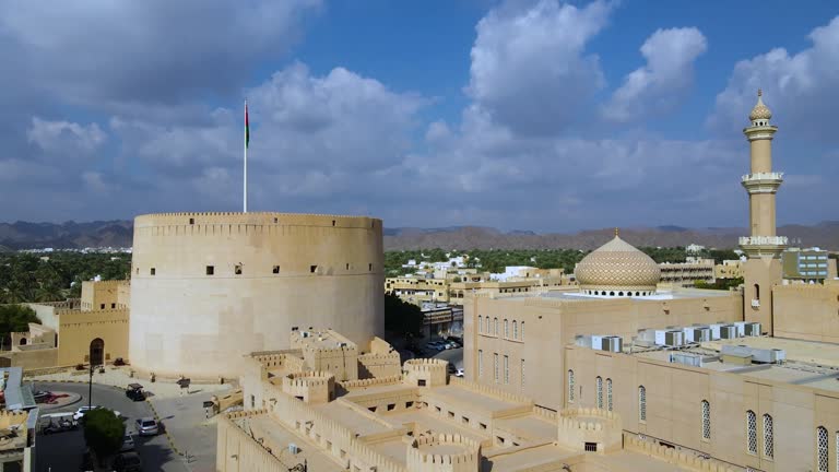 Aerial view of Nizwa Fort and Al Qala'a Mosque in Nizwa in Oman[/caption]